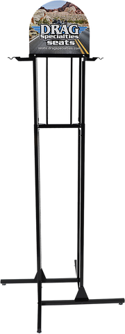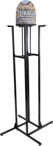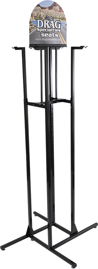 Drag Specialties Seat display stand will hold four seats, Black powder-coated 4-way steel frame with a semi-gloss finish, Seats are displayed vertically by the rear seat tab which includes about 95% of our seat applications, Seats without the rear tab will need to be displayed in a way that will not damage the seat, 79* tall including header sign, Hooks are adjustable 12* in 2* increments, Four vertical supports adjust easily from 53?* to 65?* to accommodate different seat lengths, Stand has a 36" x 36" footprint and six floor-leveling pads to allow maximum stability, Includes header sign that is printed on both sides, Easy assembly