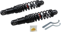 Nitrogen-charged steel monotube damper bodies with hard chrome-plated shafts, Dual-rate progressive wound springs for a smooth, comfortable ride, Adjustable spring preload, Ride-height adjustable, +/- 1/2" from size listed, Black shocks feature black springs and damper bodies with black end caps/eyelets, Mount with existing hardware, Shocks shorter than OE length have reduced travel, this may affect the ride quality and handling of the motorcycle., Lowering the motorcycle will reduce ground and cornering clearance., Before purchasing or attempting to install shocks that are different than the OEM length, confirm that your wheel travel can be altered without causing clearance issues such as swingarm/axle to exhaust contact, as well as chain/belt guard or tire contact., OE upper shock mount covers will not fit with these shocks., Not for use with rear lowering kits., May require custom mounting on models that have OEM-style offset mount shocks.