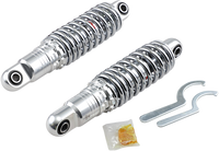 Nitrogen-charged steel monotube damper bodies with hard chrome-plated shafts, Dual-rate progressive wound springs for a smooth, comfortable ride, Adjustable spring preload, Ride-height adjustable, +/- 1/2" from size listed, Black shocks feature black springs and damper bodies with black end caps/eyelets, Mount with existing hardware, Shocks shorter than OE length have reduced travel, this may affect the ride quality and handling of the motorcycle., Lowering the motorcycle will reduce ground and cornering clearance., Before purchasing or attempting to install shocks that are different than the OEM length, confirm that your wheel travel can be altered without causing clearance issues such as swingarm/axle to exhaust contact, as well as chain/belt guard or tire contact., OE upper shock mount covers will not fit with these shocks., Not for use with rear lowering kits., May require custom mounting on models that have OEM-style offset mount shocks.
