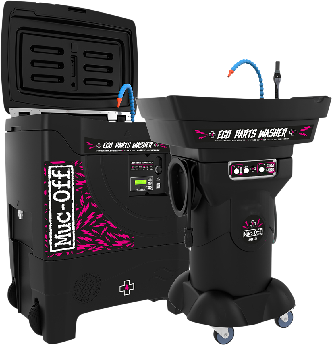 Eco Parts Wash to be replaced once a year (depending on usage) filters can be washed, Eco Powder Tab must be added every 5 weeks on average for efficient bioremediation, Standard temperature: 100.4 F (Boost Mode: 109.4 | F: +50% for cleaning performance), Water-based solution & ergonomic design makes it safe and simple to use, Solvent-free biodegradable eco wash makes cleaning tough grime easy, Electric consumption: 200 W/H (Eco Mode 12 H/day: reduction of 25%), Mobile 2 integrated wheels + 2 integrated wheels with brake, Suitable for both bicycle and powersports workshops, Soaking area volume: 30 L / soaking height: 3.35", Eco refill liquid, Eco power tabs are included, Tool holder: interchangeable brush, Payload: 100 kg/220.46 lb, Power supply: 120V + T, Lid limits evaporation, Heating power: 1 KW