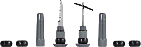 Comes as a pair: includes stainless steel 2-in-1 puncture plug/reamer tool, knife trimming tool, 5 each thin, medium, & thick tire worms, CNC Machined from 6061 aluminum, Expanding silica plug fits most MTB, Gravel & Road Handlebars with a larger than 17mm inside diameter, Supplied with 17mm, 19mm, and 21mm silica plugs to fit different handlebar diameters, Screws into bars using a just a 4mm Allen key, Plugs and Repairs multiple holes that won*t seal with just sealant, Compatible with most open-end grips and drops bars with a 84mm straight section at the bar end, Weight - 33g per side (excluding tire worms), Dimensions - 89 x 27 x 27mm