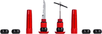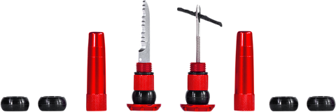 Comes as a pair: includes stainless steel 2-in-1 puncture plug/reamer tool, knife trimming tool, 5 each thin, medium, & thick tire worms, CNC Machined from 6061 aluminum, Expanding silica plug fits most MTB, Gravel & Road Handlebars with a larger than 17mm inside diameter, Supplied with 17mm, 19mm, and 21mm silica plugs to fit different handlebar diameters, Screws into bars using a just a 4mm Allen key, Plugs and Repairs multiple holes that won*t seal with just sealant, Compatible with most open-end grips and drops bars with a 84mm straight section at the bar end, Weight - 33g per side (excluding tire worms), Dimensions - 89 x 27 x 27mm
