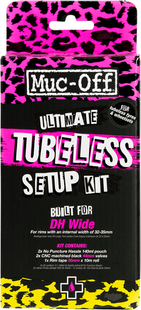 Ultimate Tubeless Setup Kit - DH/Plus Included in the kit:, 10 M of Tubeless Rim Tape, Seal patches, 2 CNC-machined black tubeless valves, 2 Pouches of No Puncture Hassle Tubeless Sealant