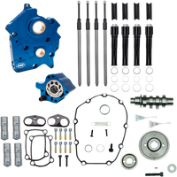 All parts in each kit are matched to ensure superior quality, fit, finish and performance, Oil pump and cam plate are precision-machined from billet aluminum with a blue anodized finish, Passage plugs removable for servicing, Independent scavenge sections for the flywheel cavity and cam chest, Debris screens in both scavenge pickups, Increased oil flow capacity on both the feed and scavenge sides, Adjustable Pressure Relief Valve is adjustable with unit installed in engine, Magnet in cam chest to help to stop debris from entering oil pump, S&S Quickee Pushrods with finished pushrod tubes, S&S premium tappets, Billet aluminum tappet cuffs have a hard-anodized black coating and are stronger than stock to eliminate distortion, Improved tappet stability in high-lift and high-rpm situations, Provides improved cam timing accuracy and eliminates the stock cam chain tensioner, Includes outer drive gears, all gaskets, bearings, and hardware required for a complete installation, Made in the USA