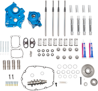 All parts in each kit are matched to ensure superior quality, fit, finish and performance, Oil pump and cam plate are precision-machined from billet aluminum with a blue anodized finish, Passage plugs removable for servicing, Independent scavenge sections for the flywheel cavity and cam chest, Debris screens in both scavenge pickups, Increased oil flow capacity on both the feed and scavenge sides, Adjustable Pressure Relief Valve is adjustable with unit installed in engine, Magnet in cam chest to help to stop debris from entering oil pump, S&S Quickee Pushrods with finished pushrod tubes, S&S premium tappets, Billet aluminum tappet cuffs have a hard-anodized black coating and are stronger than stock to eliminate distortion, Improved tappet stability in high-lift and high-rpm situations, Provides improved cam timing accuracy and eliminates the stock cam chain tensioner, Includes outer drive gears, all gaskets, bearings, and hardware required for a complete installation, Made in the USA