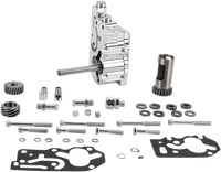 Supply-side gears are 9% wider than stock, Return gears are 28% wider than stock to ensure that the additional volume of oil supplied to the engine is scavenged and returned to the oil tank, reducing the amount of oil in the crankcase breather, Oil pumps only include supply gears, return gears, drive shaft keys, drive shaft snap rings, check ball, check ball spring, pressure valve spring, cover screws with O-rings, miscellaneous hose fittings, plugs, screws, gaskets, mounting hardware and instructions, Made in the U.S.A.