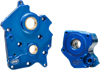 Precision Machined from Billet Aluminum, Independent Scavenge Sections for Flywheel Cavity and Cam Chest, Debris Screens in both scavenge pickups, Magnet in cam chest to help prevent debris from entering pump, Increased flow capacity on both feed and scavenge side, Adjustable Pressure Relief Valve can be adjusted with unit in engine, Passage Plugs are removable for Servicing, Blue Anodized Finish, Made in USA