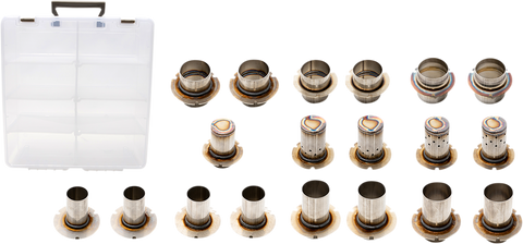 Includes two each of the 1.375", 1.5", 1.625", 1.75" plugged front with 3.5mm holes, 1.75" plugged rear with 3.5mm holes, 1.875", 2", 2.25", and one 1.75" plugged, Tunable inserts allow for easy sound and power adjustment, Power and torque tuning, Tone and sound adjustment, Easy to install
