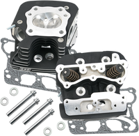 High port flow gives great performance now, and more later when additional upgrades are done, Heads are fully assembled with springs and valves, Compression ratios vary depending on cylinder heads chosen, pistons used and engine displacement; see Compression Ratios chart for specifications, 79cc heads work great with stock motors for 88" to 103" motors; 89cc heads work best for motors over 103" or with high-compression pop-up pistons, 79cc have 1.940" intake and 1.575" exhaust valve and springs for up to .650" lift; 89cc have 2.000" intake and 1.605" exhaust and .640" springs, 79cc heads accept OEM rocker boxes, 79cc and 89cc heads require S&S Lower Rocker Box Gasket Kit (0934-4574), Heads are machined for compression releases (sold separately); S&S rocker boxes required when using S&S compression releases, Do not include rocker arm components, intake manifold or gaskets, Heads include four long headbolts, and reuse four long OEM headbolts, Accept OEM intake manifolds, Made in the U.S.A., Must use S&S rocker boxes (PART #90-4110) if S&S compression releases are used.